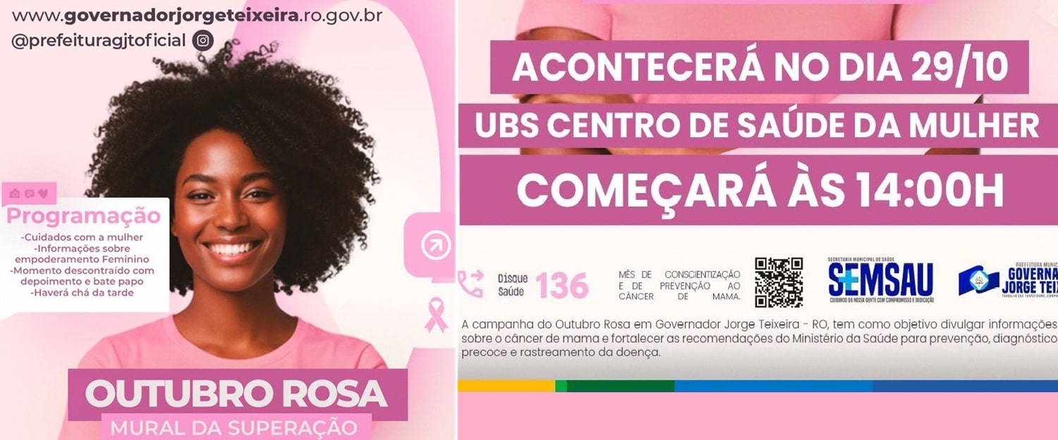 A Secretaria Municipal de Saúde de Governador Jorge Teixeira vai promover nessa quarta-feira, 29/10, a partir das 14:00h, um evento com ações do Outubro Rosa, campanha mundial de conscientização sobre a importância da prevenção e do diagnóstico precoce do câncer de mama. Voltado ao autocuidado e à promoção da saúde da mulher, o evento que acontecerá no Centro de saúde da Mulher, vai reunir profissionais da rede municipal de saúde, autoridades e a comunidade em geral.